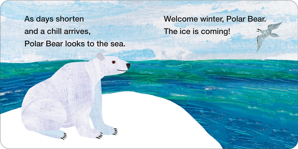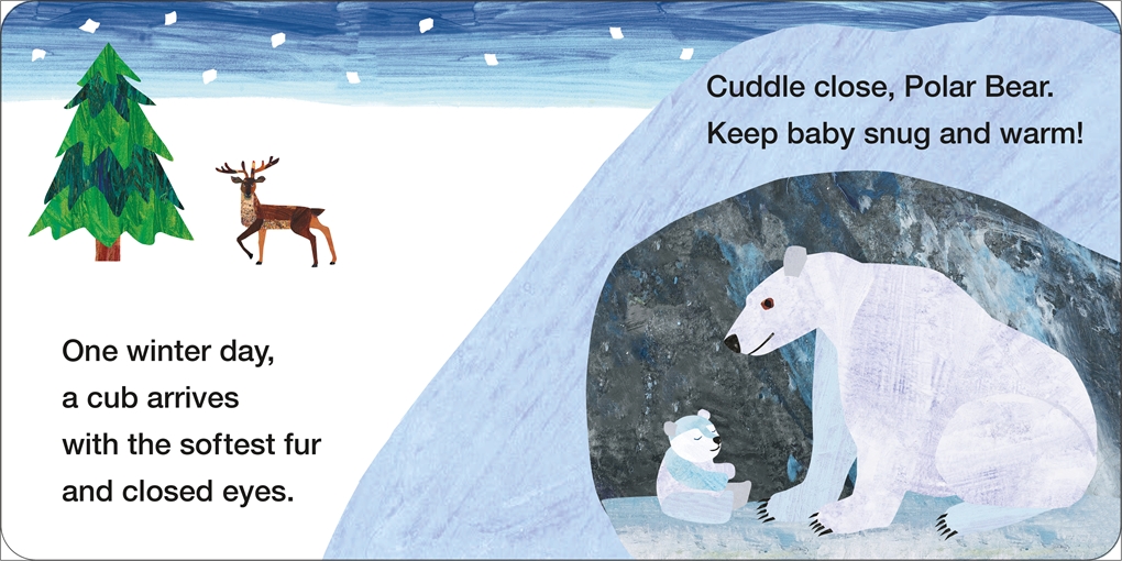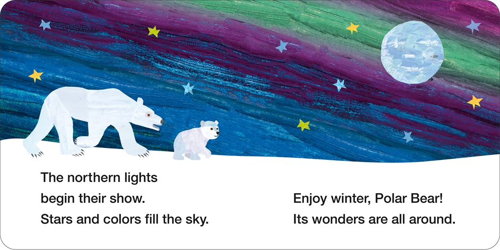 This charming, cozy board book for young readers (ages 0-3), follows Polar Bear and friends as they prepare for the cold season. The story unfolds with the heartwarming arrival of a new cub, and children will delight in the cub’s first winter adventures and the breathtaking beauty of the glowing northern lights filling the sky. Inspired by Bill Martin Jr and Eric Carle’s beloved Polar Bear, Polar Bear, What Do You Hear?. The enchanting and iconic illustrations of Eric Carle bring this frosty, wonderful world to vibrant life.