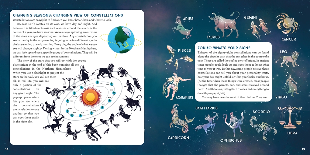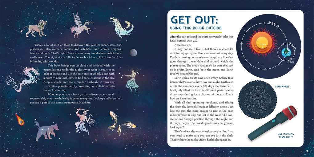Take this book outside and use the built-in star wheel cover to find constellations in the sky. Keep it inside and use the included pop-up star map to turn any room into a planetarium by projecting constellations onto the wall or ceiling. Whether you have a front yard or a fire escape, a small room or a big one, the whole sky is yours to explore.